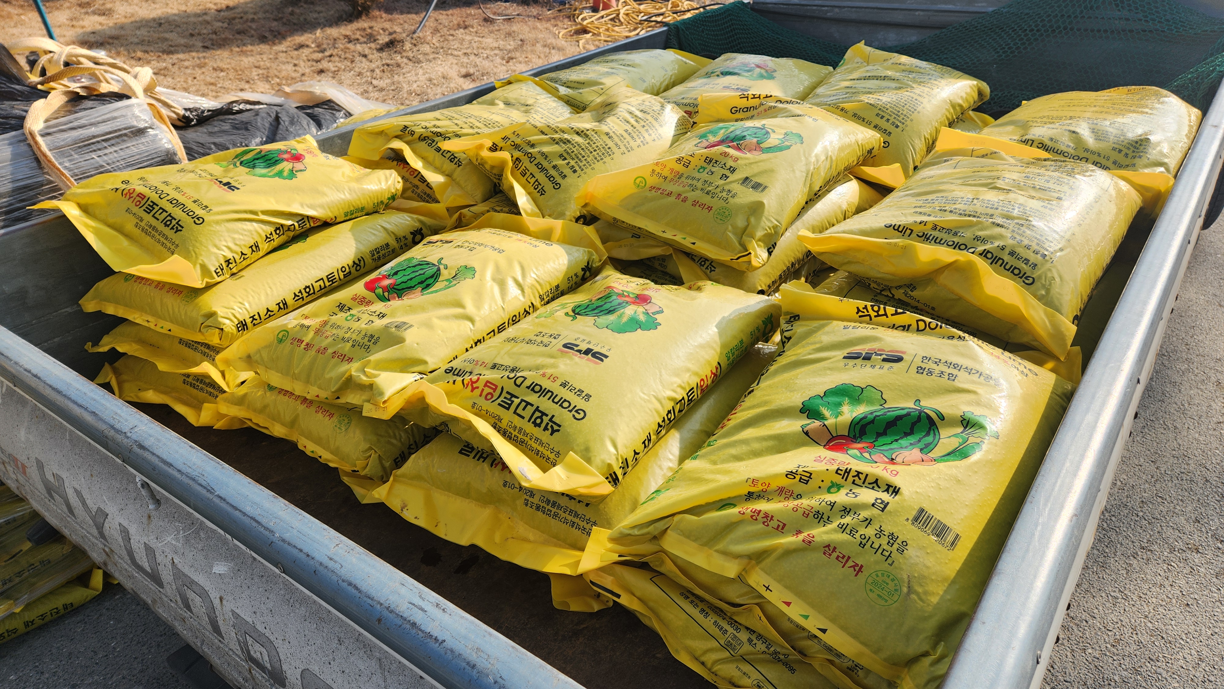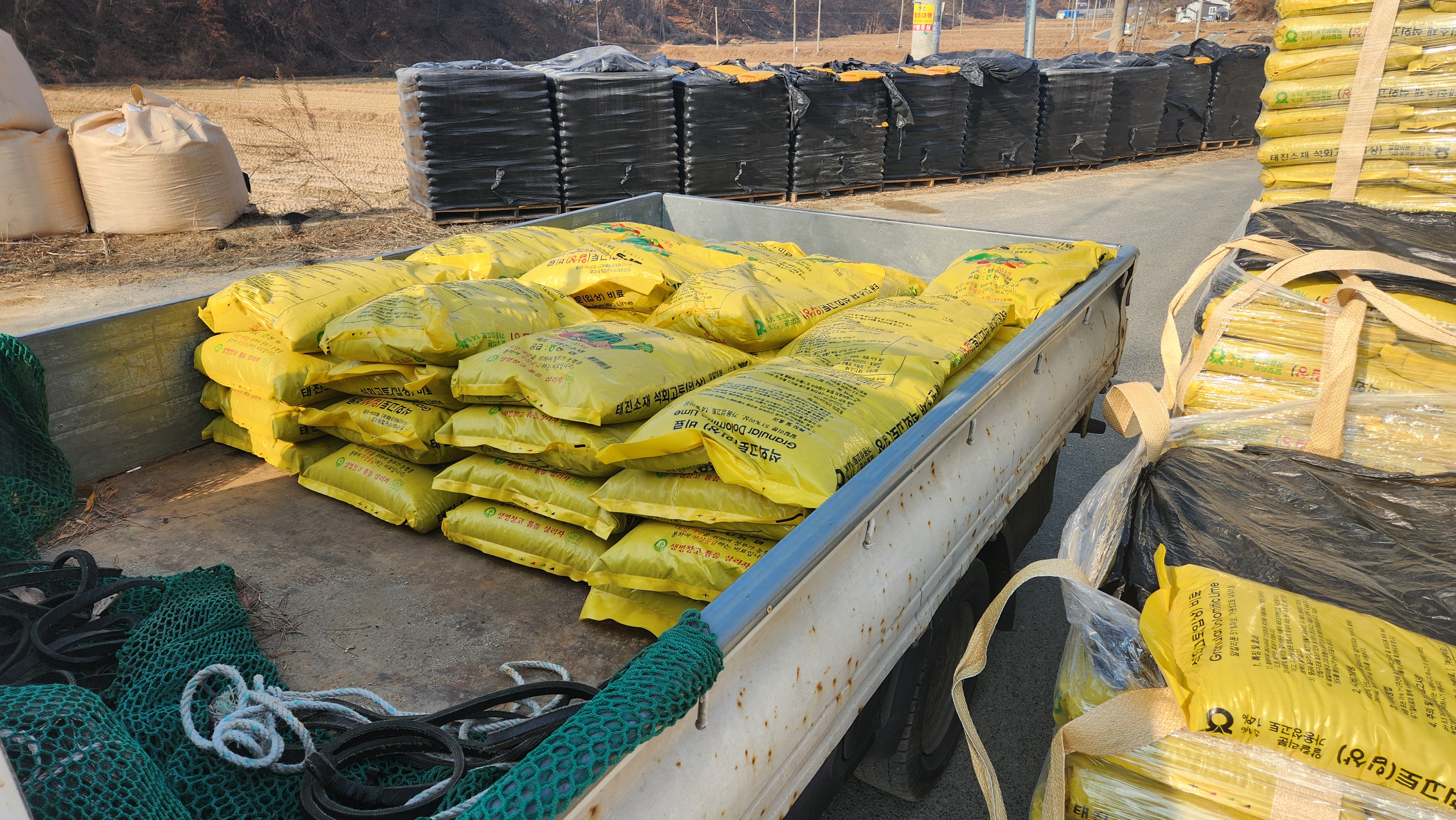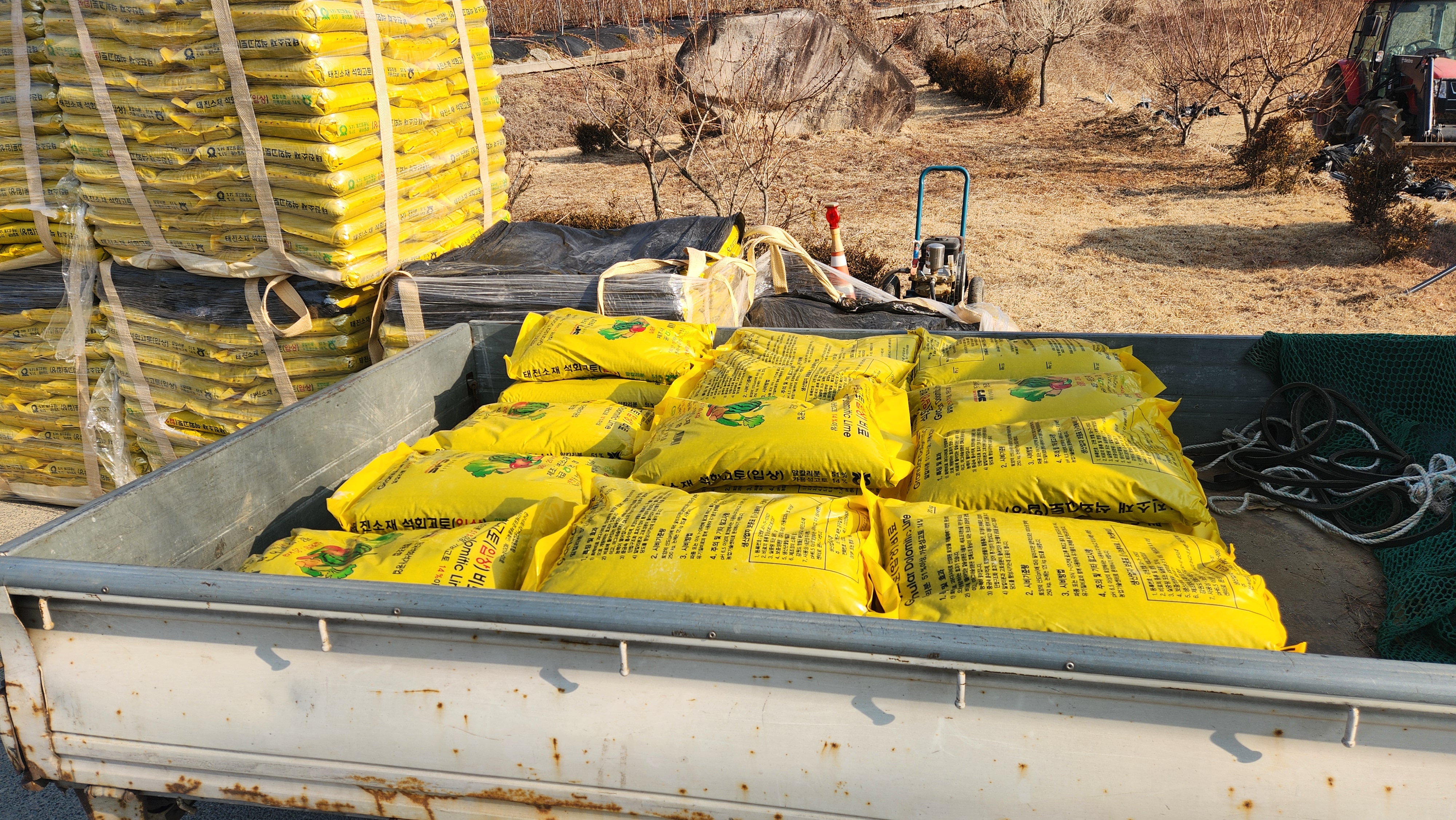 배정된 45포를 실어서 3곳(와룡면2곳 남선면)의 밭에 갖다 놓았다. 다음에 유황비료와 칼슘비료을 뿌릴 때 같이 살포할 생각이다.
